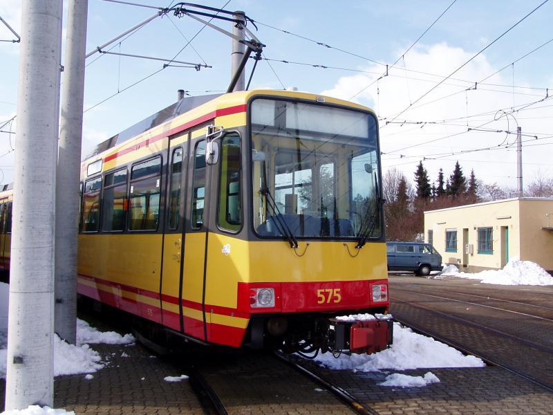 Hier sieht man eine neue Straßenbahn die am 23.2.2005 im Mannheim Hbf hilt.