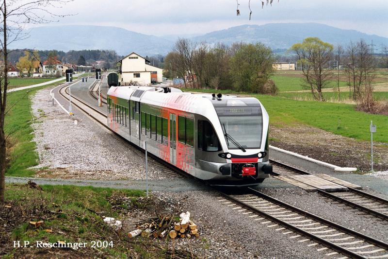17.4.2004: Probefahrt mit dem Stadler GTW der Vintschgerbahn auf der GKB - hier verläßt der Triebwagen gerade den Bahnhof Bergla