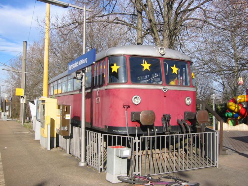 Bahnhof Karlsruhe-Mühlburg am 08.01.2005. Der alte Schienenbus-Beiwagen BR 998 895 wird von dem im Bahnhofsgebäude angesiedelten Fast-Food-Laden für Kinderfeiern genutzt.