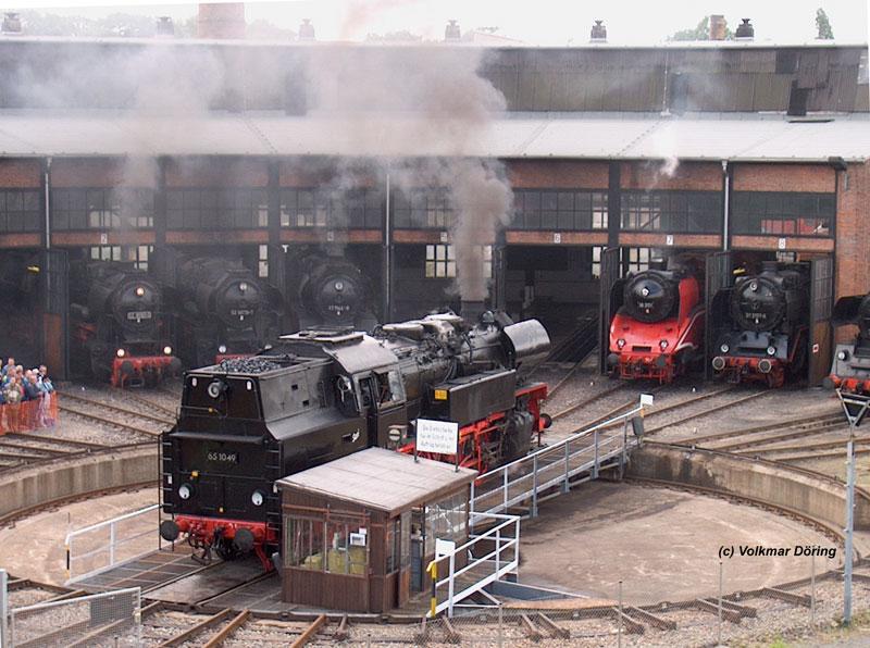 Der Lokschuppen Dresden-Altstadt kommt wieder mal zu seinen Ehren u.a. mit 52 8079, 41 1144, 18 201, 01 2100 Davor auf der Drehscheibe 65 1049 - 22.05.2004 - Dampflokfest
