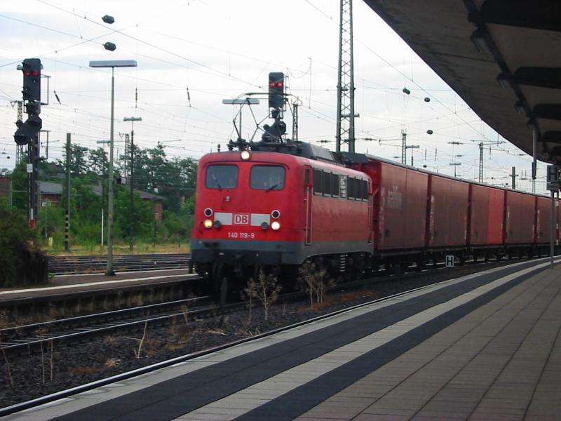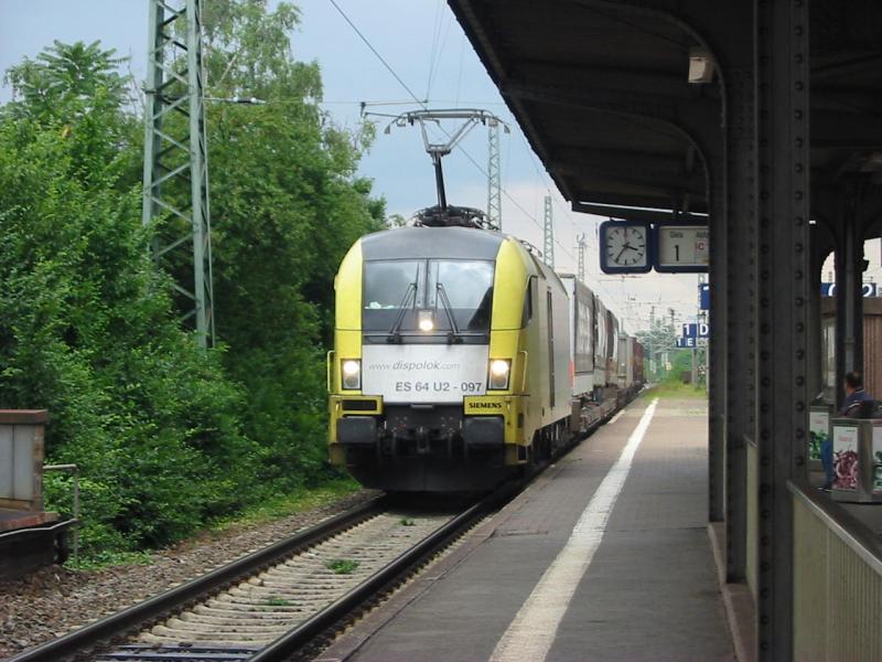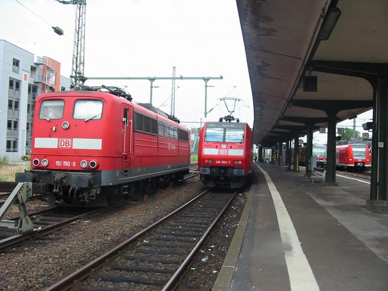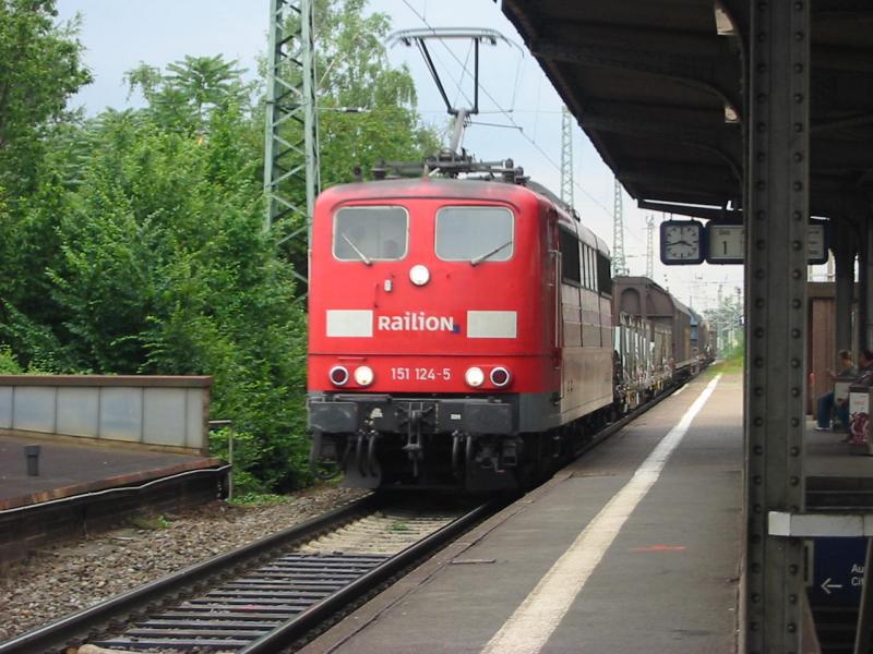 Weil der RE nach Mainz verspätung hatte stand an Gleis zwei die RB nach Mainz und links fuhr gerade die 185-037 mit ihrem Güterzug in Richtung Mainz. 4.7.2005