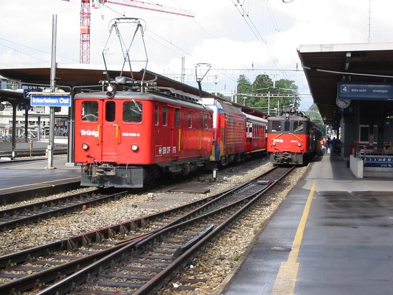 Bahnhof Interlaken Ost im Juli 2003. Hier ist einer der Ausgangspunkte für die Brüningbahn, der einzigen Schmalspurbahn der SBB zwischen Luzern und Interlaken. In dem Bild ist ein abfahrbereiter Zug der Brüningbahn Richtung Luzern zu sehen.