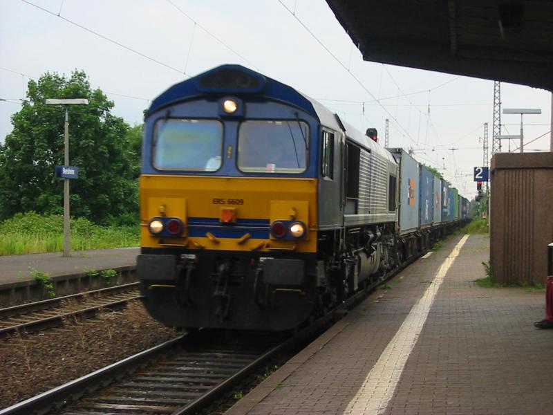 Class 66 ERS 6609 der Firma ERS Railways am 2.7.2005 mit einem Güterzug bei der Durchfahrt von Bensheim.