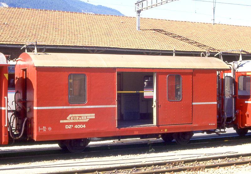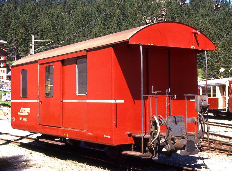 DZ² 4004II GEPÄCK- und POSTWAGEN am 19.08.1989 in Arosa - Baujahr 1908 - RASTATT/PAG - Fahrzeuggewicht 7t - Zuladung 5t - LüP 8,72m - V = 60km/h. - Mutation: ex F 524 - 1911 F 4024 - 1961 F 4004II (neuer Stahlkasten)- 1964 D² 4004II - 1969 DZ² 4004. Hinweis: hier noch alte rote Lackierung.