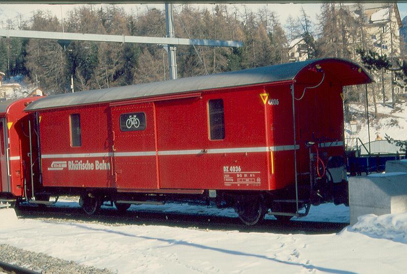 DZ² 4036 GEPÄCK- und POSTWAGEN nur für Berninabahn am 09.05.1991 in St.Moritz - Baujahr 1913 - SIG - Fahrzeuggewicht 9t - Zuladung 10t - LüP 10,65m - V = 65km/h. - Mutation: ex F 4036 - 1949 FZ 4036 - 1964 DZ² 4036. Hinweis: noch alte rote Lackierung