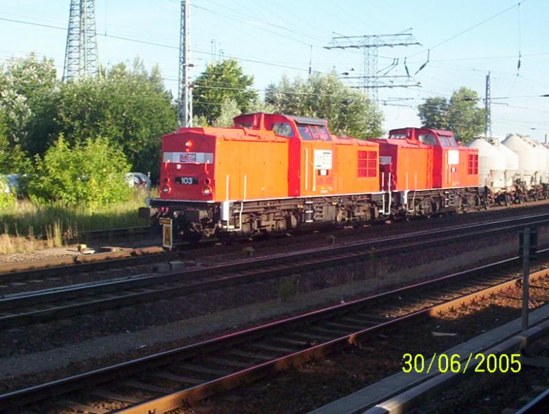 MEG103 & MEG101 am 30.06.2005 mit ihrem Cementzug auf der Fahrt von Berlin Nord/Ost nach Rüdersdorf. Hier im Berlin Springfuhl.