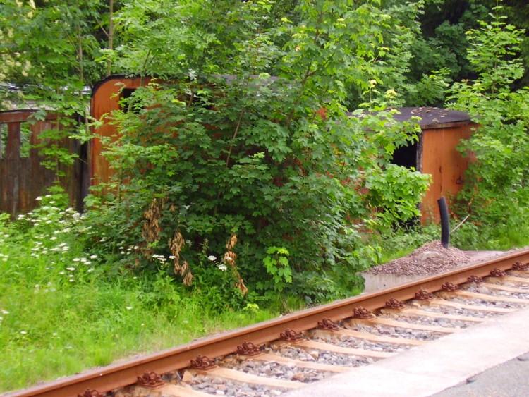 Nebenbahnromantik... 2 Alte Wagenkästen, darunter ein Packwagenkasten in Antonstal 01.07.05 Mittlerweile wurde das Strauchwerk rundum abgeschnitten und man hat freie Sicht auf das gute Stück