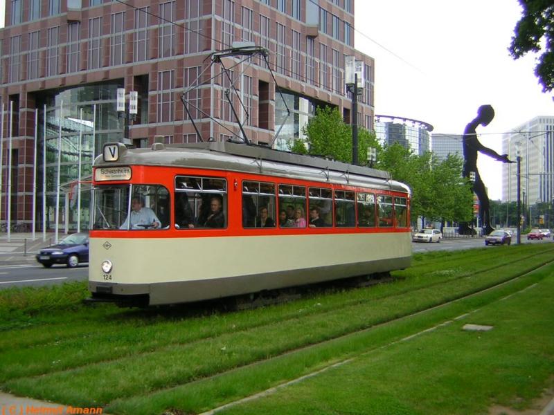 Vor dem gewaltigen Sockel des Messeturms und der Skulptur "Hammering Man" (im Bildhintergrund) befand sich der L-Triebwagen 124 (ex 224) am 21.05.2005 auf Sonderfahrt bei der Einfahrt in die Haltestelle Festhalle / Messe.