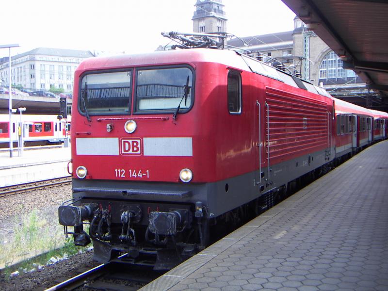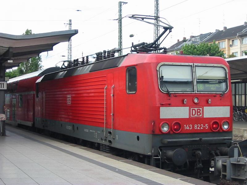 143-822 schiebt am 7.7.2005 ihre RB nach Bingen (Rh) Stadt, hier noch in Mainz Hbf.