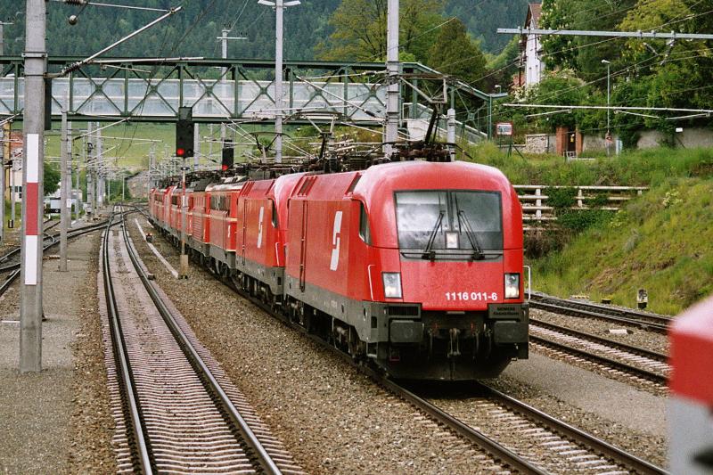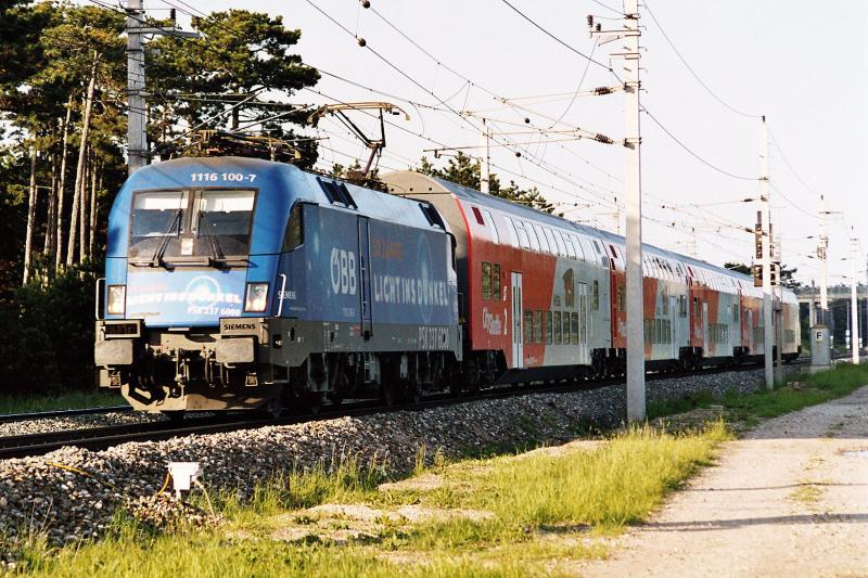 Der ehemalige "Licht ins Dunkel" (LiD) Taurus 1116 100 am 14.5.2004 mit einer Doppelstockgarnitur kurz vor Neunkirchen. Heute ist die 1116 100 leider wieder im ÖBB-Einheitsrot zu sehen