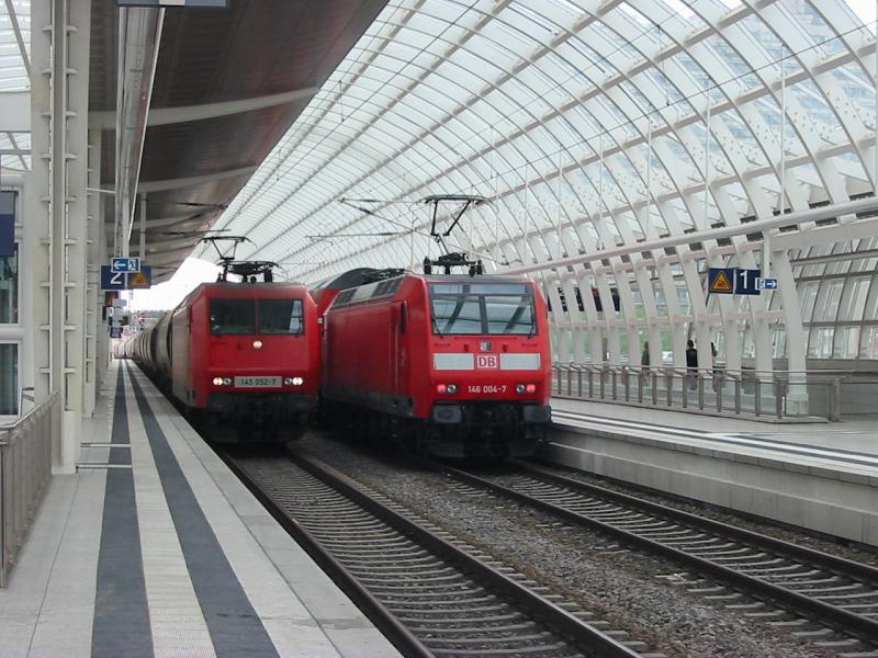 145-052 bei der Durchfahrt von Ludwigshafen Mitte und 146-004 bei der Ausfahrt von Ludwigshafen Mitte.