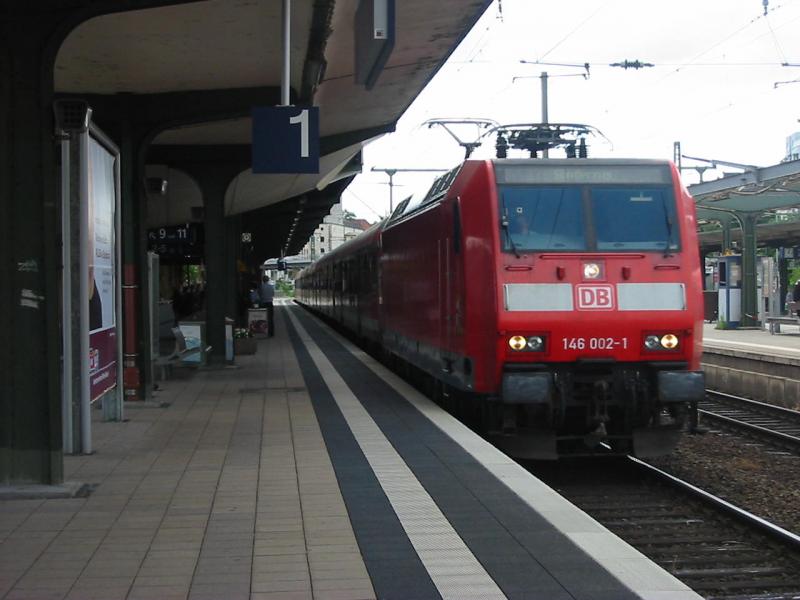 146-002 fuhr am 5.7.2005 mit einem Sonderzug der aus alten Flachwagen bestand durch Worms Hbf, man beachte das Lokführerfenster dort kann man eindeutig ein Kamera erkennen, was ist an einem Fotografen den so besonders.
