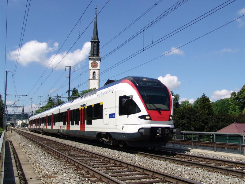 RABe 523 011-5 am 3.7.05 in Cham. Im Hintergrund sieht man die Röm. Kath. Kirche St. Jakob