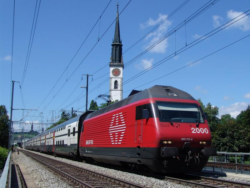 Re 460 112-6 "Thurtal" am 3.7.05 in Cham. Im Hintergrund sieht man noch die Röm. Kath. Kirche St. Jakob