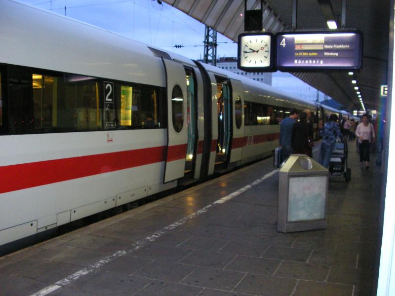 Am späten Abend ist es sehr ruhig im ICE. Hier der etwa 45 Minuten verstpäteten ICE 929 bei der Fahrt von Hamburg nach Nürnberg am 02.07.2005.