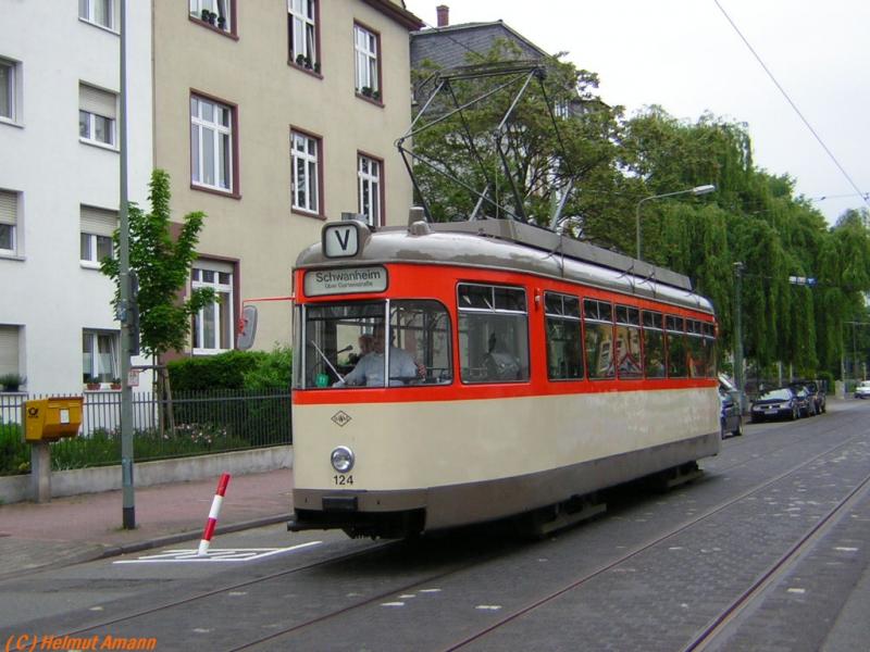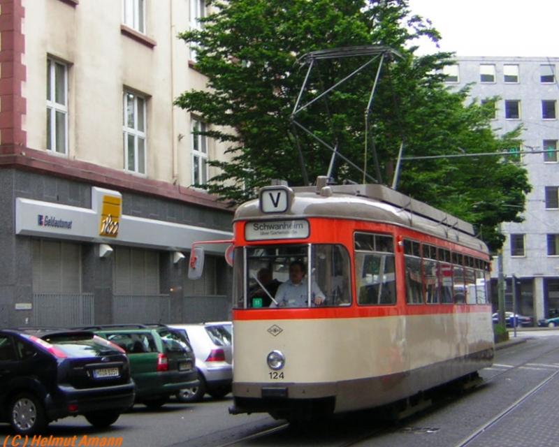 Bei der Sonderfahrt des L-Triebwagens 124 (ex 224) am 21.05.2005 legte der Triebwagen auf dem Rasengleis zwischen den Haltestellen Niederräder Landstraße und Heinrich-Hoffmann-Straße / Blutspendedienst einen Fotohalt ein.