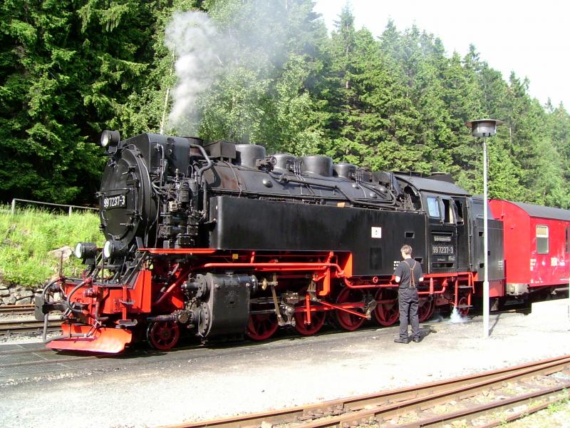 Die 99 7237-3 der Harzer Schmalspurbahnen im Bahnhof Drei-Annen-Hohne wird für die Weiterfahrt auf den Brocken vorbereitet.