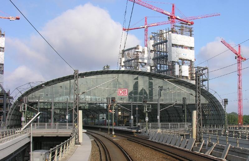 Die Baustelle Berlin Lehrter Hauptbahnhof von der Ostseite am 16.07.2005 aus dem Schlußwagen des EC 171 nach Budapest aufgenommen.