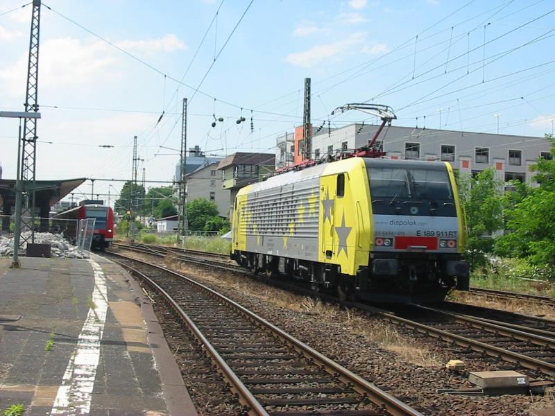 E189-911 der Firma Dispolok bei der Ausfahrt von Worms Hbf am 13.7.2005