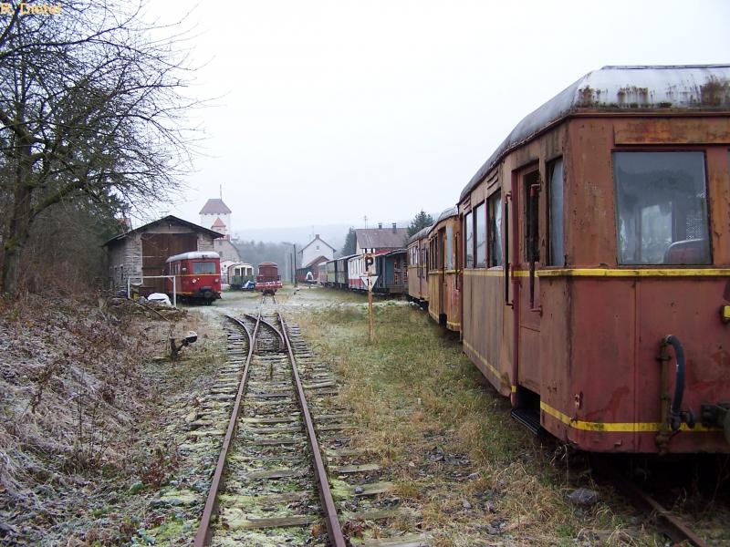 Einfahrtsgleis in den Bahnhof Bieringen, Richtung Möckmühl. Hier ist momentan der größte Teil des rollenden Materials der Jagsttalbahn abgestellt. Leider sind die Fahzeuge, bedingt durch fehlende Abstellmöglichkeiten in Schuppen o. ä. hilflos Farbschmierern und Witterungseinflüssen ausgesetzt, was teilweise schon als großer Korrosionsschaden sichtbar ist. Im Vordergrund ist der 4-teilige Triebwagenzug der vor etlichen Jahren nach Stilllegung der Rhein-Sieg-Eisenbahn zur Jagsttalbahn gekommen ist zu sehen. Von ihm ist nur der Triebwagen VT 300 (links vor dem Schuppen) in gutem Zustand. Der Zustand der 3 Beiwagen ist leider sehr schlecht. Dezember 2004