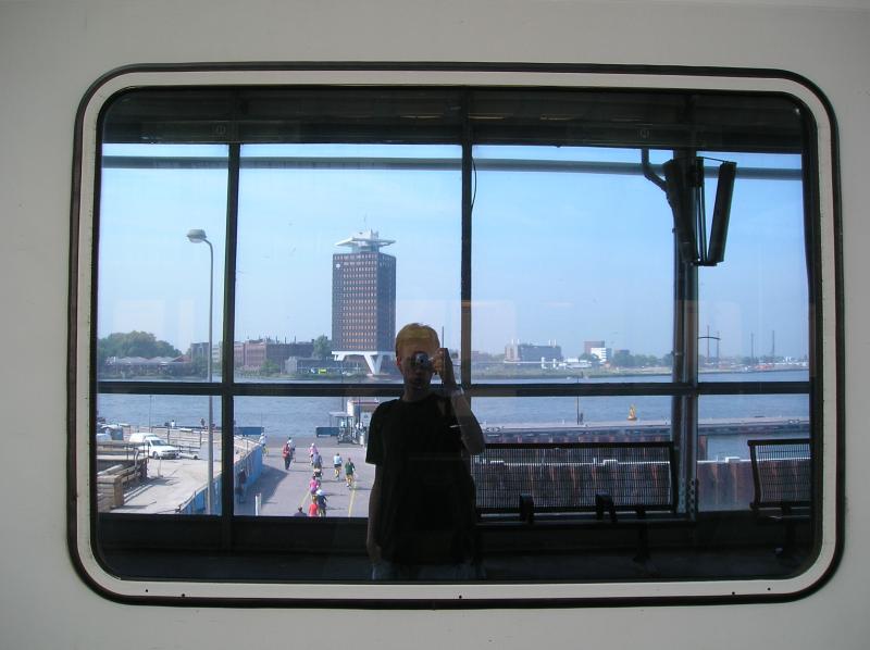 Ich liebe die Fenster eines IC. Im Hintergrund sieht man das "IJ", einem Gewässer hinter dem Amsterdam Zentralbahnhof, und einem Teil von Amsterdam-Noord.