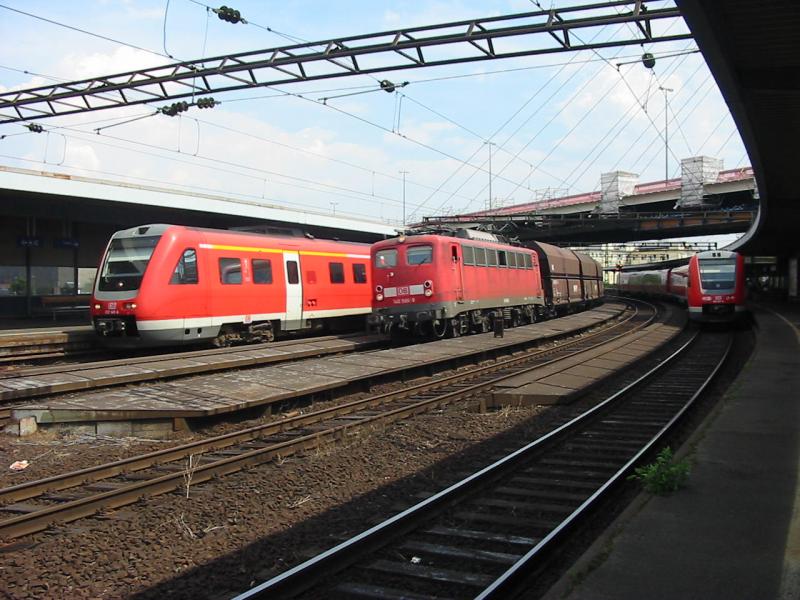Wegen Teilsperrung zwischen Speyer und Kaiserslautern fährt der RE nach Karlsruhe über Mannheim links 612-060 daneben 140-556 und ganz rechts 612-001.