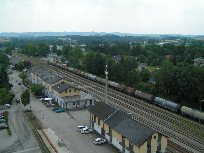 Ansicht vom Lagerhaussilo vorne links ist die Tankentladestation zu sehen; von hier führt eine 1km lange Pipeline zur Mineralölfirma; ersichtlich auch 3 weisse BB-Dienstwägen, sowie ein Kesselwagenganzzug; ersichtlich auch die Fußgängerbrücke u. die Ausfahrten Richtung Attnang u. Wels (2005-07-16)