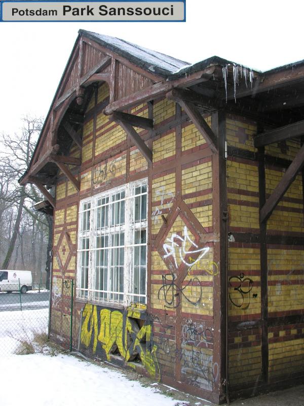 Das 1868 errichtete Empfangsgebäude des Potsdamer Kaiserbahnhofes am 04.03.2005. Es steht unter Denkmalschutz und soll bis zum Besuch des Bundeskanzlers im Mai 2005 zur Einweihung des wiedererstandenen Kaiserbahnhofs abgerissen sein - falls es nach Herrn Mehdorn geht.