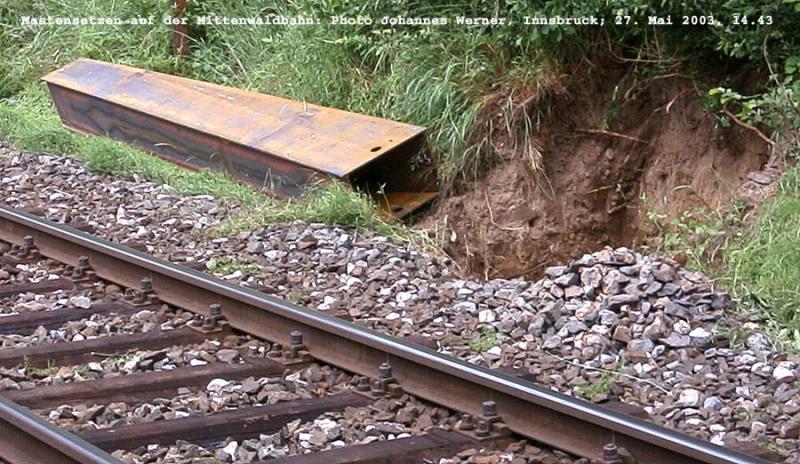 Eines Tages an der Mittenwaldbahn III: dieses ist das stählerne Fundament, das die Stahlbetonmasten tragen wird. Rechts davon unschuldige Höttinger Erde, der bereits mit der Schaufel zuleibe gerückt wurde, der Bagger ist schon unterwegs... auf den Bildern oben schön zu sehen, welche Schönheiten an Mastenwerk hier dem Beton zum Opfer gefallen sind... ich kann mir auch nicht vorstellen, daß solches im Interesse des Umweltgedankens sein kann, denn von Stahlbetonrecycling habe ich bislang noch nichts gehört, auch wurden an weniger zugänglichen Stellen in der Martinswand sehr wohl neue Stahlprofilmasten gesetzt... ich konnte und kann mir das nicht recht erklären (es wäre denn, es handelte sich um finanzielle Gründe). 27. Mai 2003