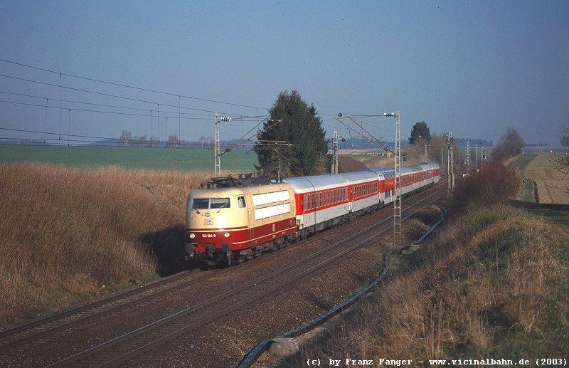 Am 2.4.02 zog 103 184 ihren Nachtzug bei Hebertshausen gen München.