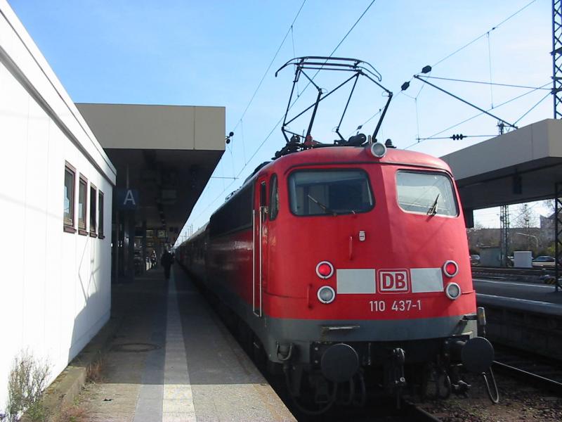 Hier schiebt die 110-437 am 21.03.2005 eine RB nach Frankfurt a. M. Hier in Mannheim Hbf.
