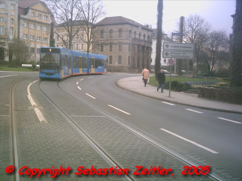 Die Linie 1 zwischen den Haltestellen Murhardstraße / Universität und Kirchweg auf ihrem Weg nach Wilhelmshöhe am Nachmittag des 30. März 2005.