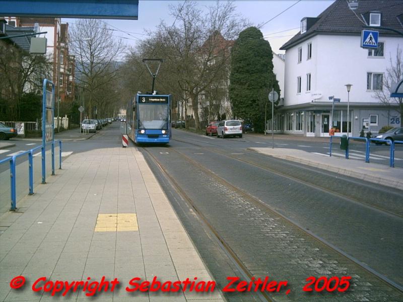 Die Linie 3 kurz nach der Haltestelle Walther - Schücking - Platz auf ihrem Weg zum Druseltal am Abend des 29. März 2005.