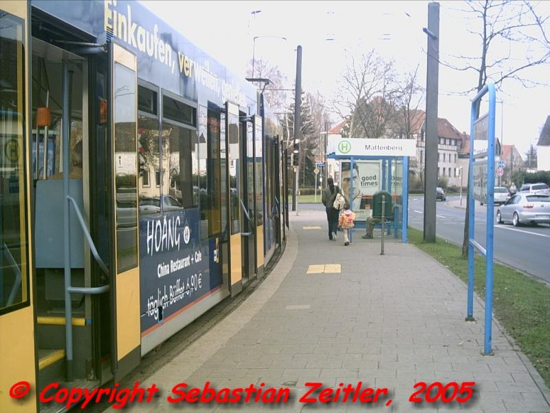 Die Linie 5 an der Haltestelle Baunatal Stadtmitte auf ihrem Weg zum Bahnhof Großenritte am Nachmittag des 28. März 2005.