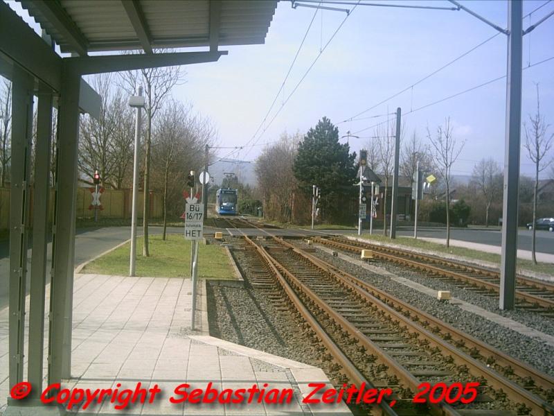 Die Linie 5 kurz nach der Haltestelle Baunatal Stadtmitte auf ihrem Weg zum Bahnhof Großenritte am Nachmittag des 28. März 2005.