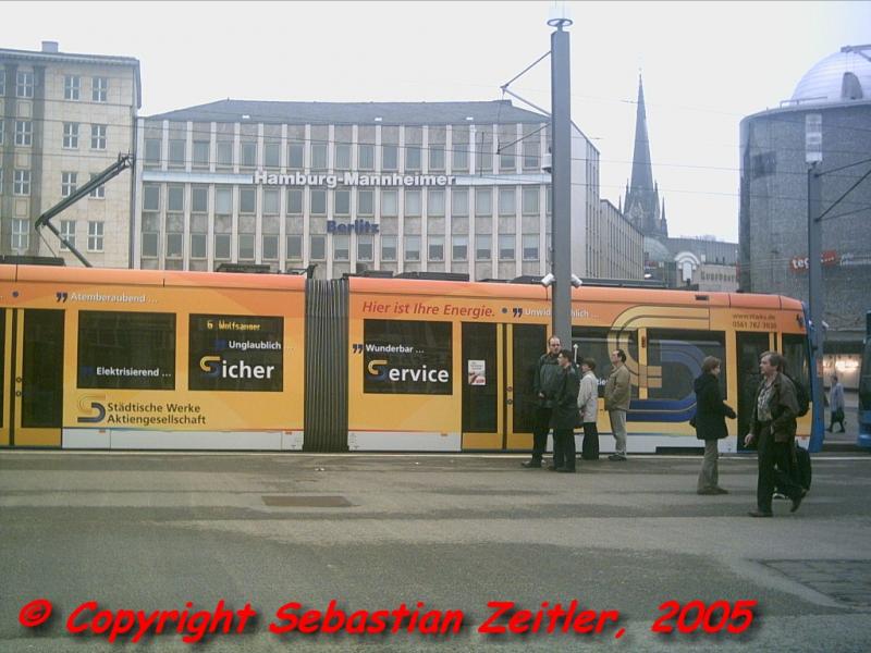 Die Linie 1 am Bahnhof Wilhelmshöhe auf ihrem Weg zur Holländischen Straße am Nachmittag des 28. März 2005.