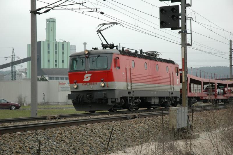 Elektrolokomotive 1044.065 der ÖBB mit einem Autoreisezug am Haken westlich von Timelkam (OÖ) am 26.3.2005 um ca. 11.20 Uhr