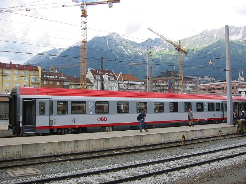 Hauptbahnhof Innsbruck am 16.07.2004. Zu sehen ein Personenwaggon im neuen ÖBB-Design.