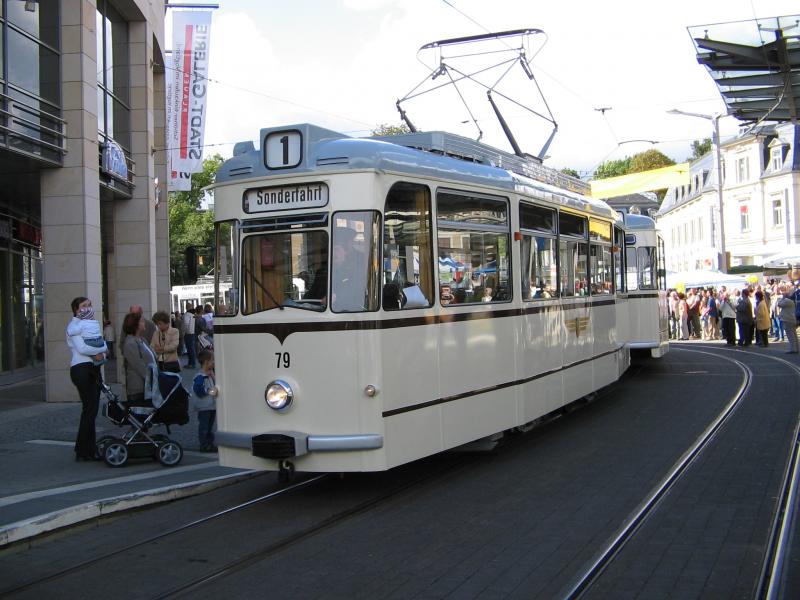 Historischer Triebwagen 79 mit Beiwagen beim Straßenbahnfest am 12.09.2004 an der Haltestelle Tunnel.