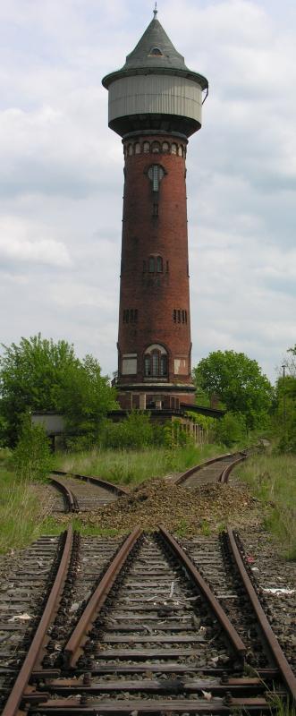 Der Wasserturm in Elstal am Bahntag (21.5.2005). Davor eine symmetrische Außenbogenweiche, längst stillgelegt und inzwischen in Selbstauflösung.