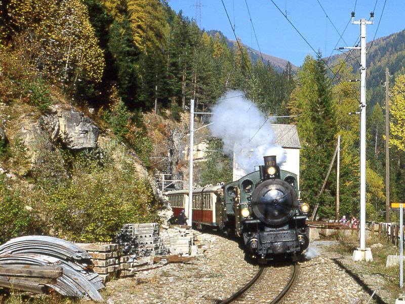 RhB Salon-Dampfzug 3153 für GRAUBÜNDEN TOURS von Davos-Platz nach Filisur vom 25.10.1997 in Davos-Islen mit Dampflok-Doppelbespannung G 4/5 107 - G 4/5 108 - As 1144 - As 1142 - As 1141 - As 1143 - As 1161. Hinweis: Hier in Davos-Islen wurde für die Fotografen und Filmer der Zug zurückgesetzt und eine Scheinanfahrt durchgeführt. Von dieser Seite ist gute Sonne bis 15:00h zur Sommerzeit. Wie aus den beiden Fotos erkennbar ist, war der Zug zum Aufnahmezeitpunkt genau in Sonnenrichtung unterwegs.