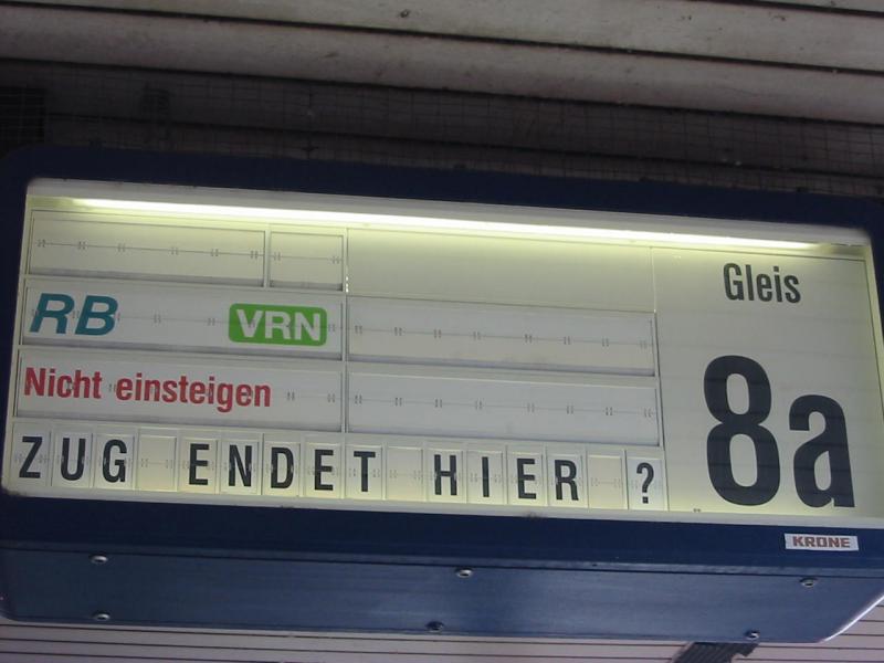 ZUG ENDET HIER?, sollen die Leute das erraten. Keine großer Flaschanzeiger aber auch einer. Gleis 8a in Mannheim Hbf.