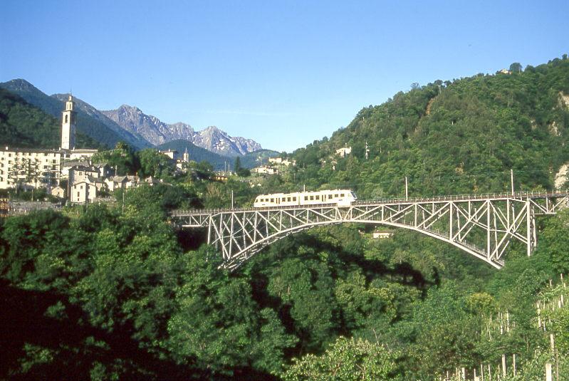 FART Centovalli-Bahn REGIONALZUG 313 von Camedo nach Locarno am 07.06.1995 bei Intragna auf Ponte Isorno mit Triebwagen ABe 4/6 51. Hinweis: Brückenhöhe 79m, Bogenweite 90m. Blick nach Intragna mit den höchsten Campanile des Tessin