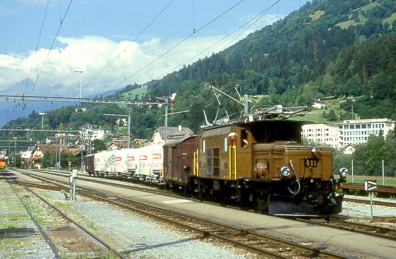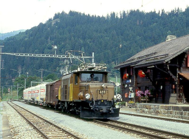 RhB GÜTERZUG 5238 von Disentis nach Landquart am 27.08.1997 Einfahrt Rueun mit E-Lok Ge 6/6I 411 - Gbkv 5561. Hinweis: Lok hat Wagen aus Militärdepot Rueun abgeholt - Lok nach Unfall 09.02.2000a - zur Zeit ausgestellt Deutsches Museum München