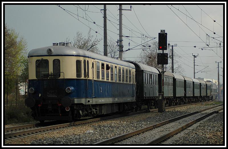 2050.02 mit Nostalgiesonderzug Waldmühle – Liesing – Sigmundsherberg - Gars-Thunau sowie VT 5042.014 als „Flügelzug“ Sigmundsherberg - Waldkirchen an der Thaya am Zugschluss, bei der Durchfahrt der Wiener S-Bahnstation Atzgersdorf-Mauer am 17.4.2006