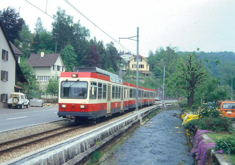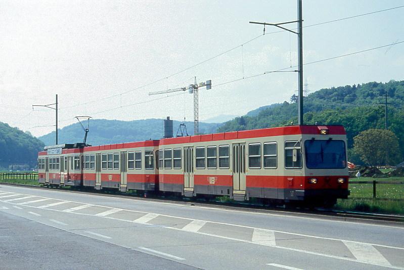 WB Regionalzug 35 von Waldenburg nach Liestal am 09.05.1993 bei Altmarkt mit Steuerwagen voraus Bt 120 - Bt 118 - Triebwagen BDe 4/4 13. Hinweis: Rückansicht