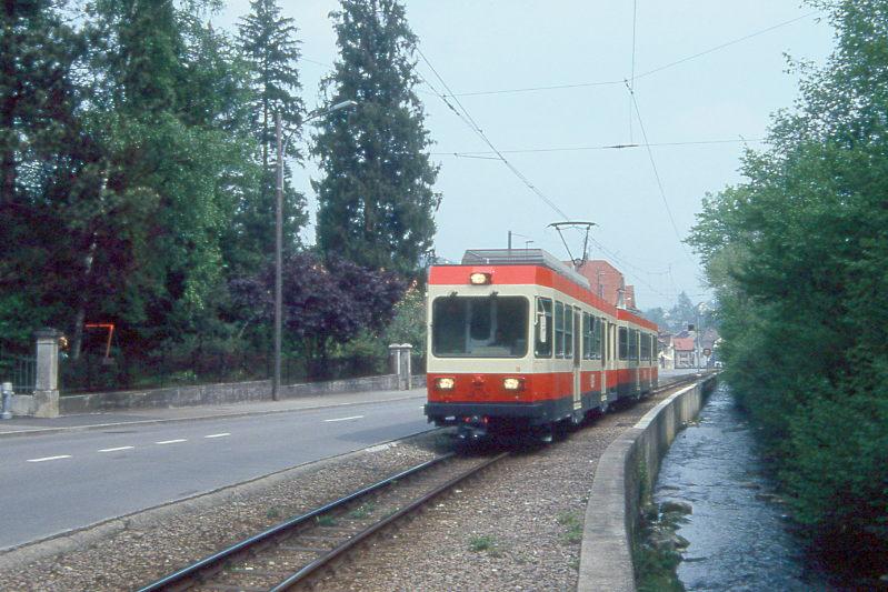 Triebwagen der OC Baujahr 1915 BDe 4/4 12 vor dem Bahnhof Orbe im August 1985