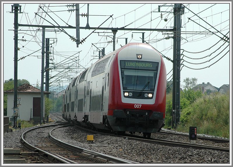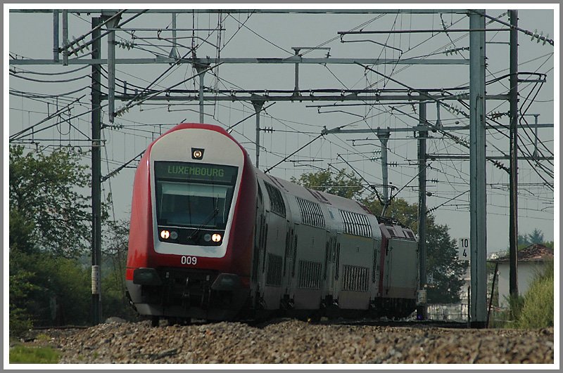 Auf diesem Foto ist eine reine Bombardiergarnitur zu sehen. 18 Steuerwagen und 67 Mittelwagen stehen bei der CFL zur Zeit im Einsatz. Als Zug- bzw. Schubmaschinen kommen 20 Lokomotiven der Reihe 185.1 zum Einsatz, die in Luxemburg als Serie 4000 bezeichnet wird. Die Aufnahme entstand am 27.7.2006 zwischen Berchem und Luxemburg.