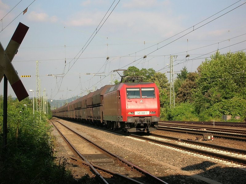Diese 145 096-1 mit einem Zug aus Schüttgutwagen am 7.8.2006 kurz vor Neuwied.