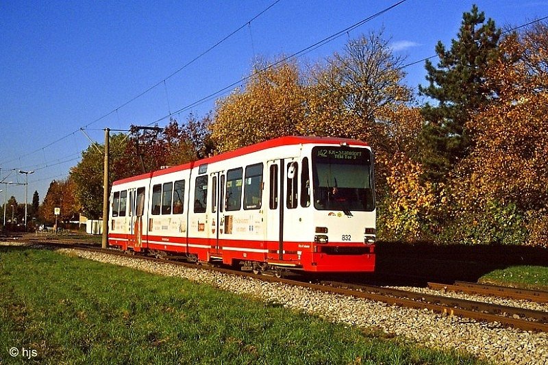 Der Triebwagen mit der runden Nummer 1000 hat eine bemerkenswerte Karriere hinter sich: vom Einrichtungs-Sechsachser über mehrere Etappen zum teilniederflurigen Zweirichtungs-Zehnachser. Die Aufnahme entstand am 7. April 2003 in DU-Walsum an der (H) Watereck.